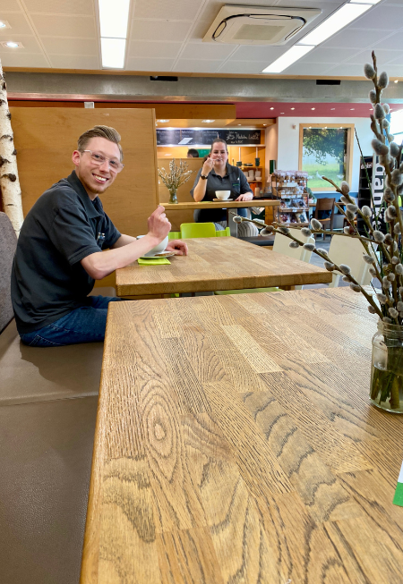 Wer regelmäßig bei uns am Kamp vorbeischaut, hat es vielleicht schon bemerkt: Unser kleiner Nachbarschafts-Bio-Markt ist noch ein Stück gemütlicher geworden. Denn viele von euch kommen gern auf einen Kaffee, einen Snack oder den Mittagstisch vorbei – und nehmen sich Zeit zum Plaudern, Lesen oder einfach zum Durchatmen. Genau darauf haben wir reagiert.